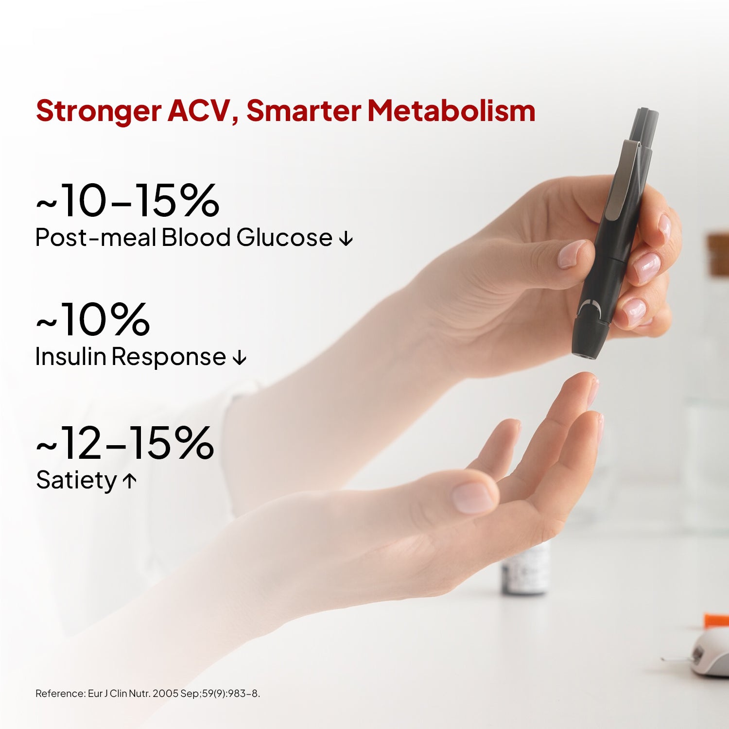 Research shows acetic acid lowers post-meal blood glucose responses by up to 31% and boosts insulin-stimulated glucose uptake by ~32% when taken before meals. This formula delivers 10% acetic acid, higher than most effervescent ACV products. [1]