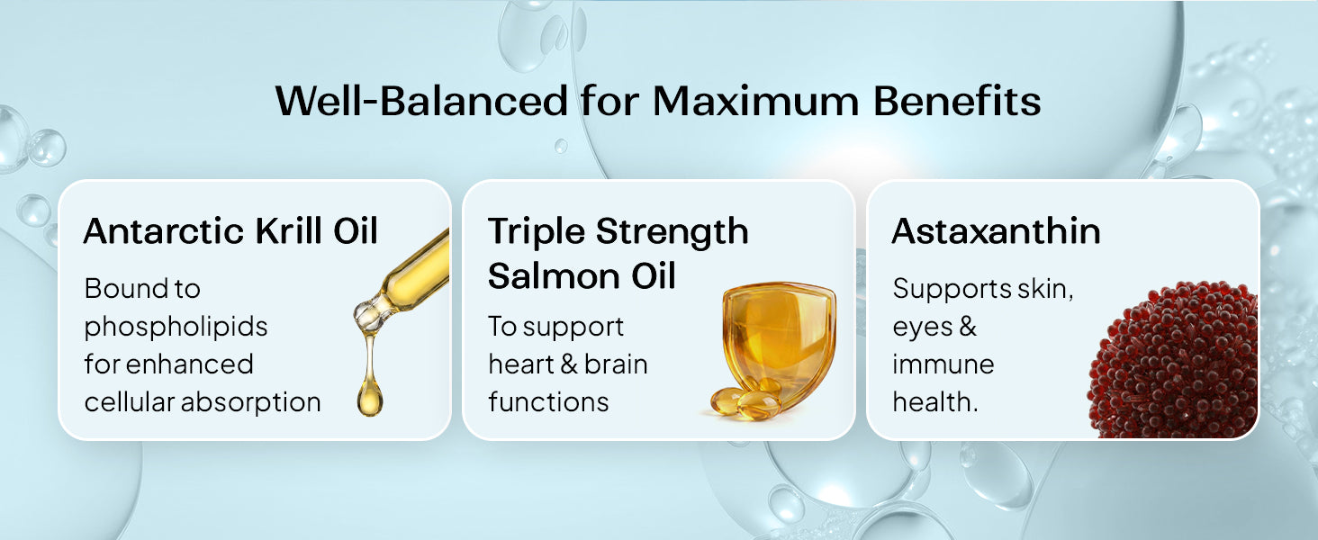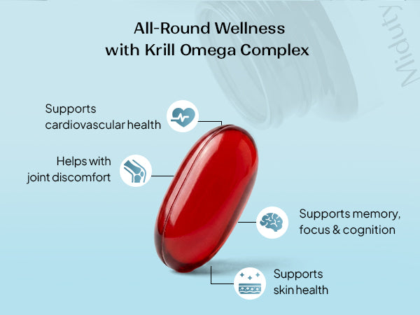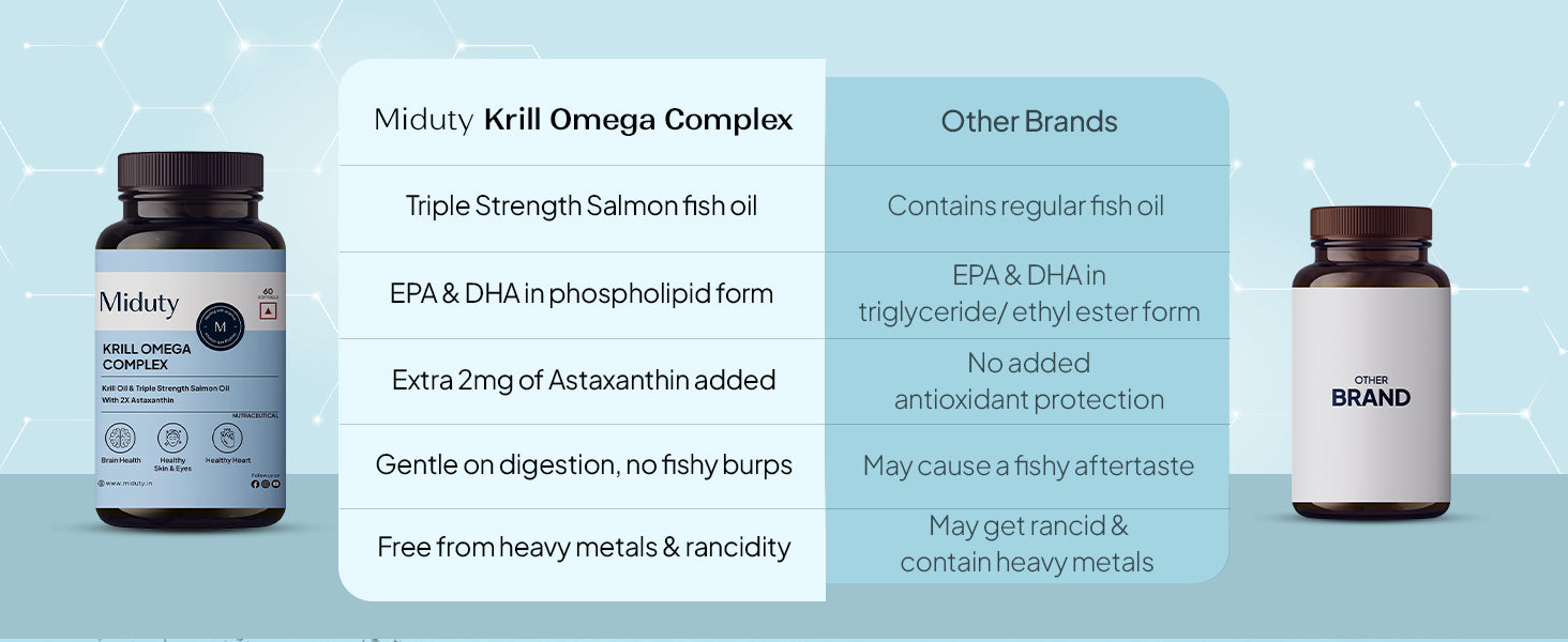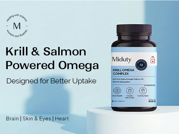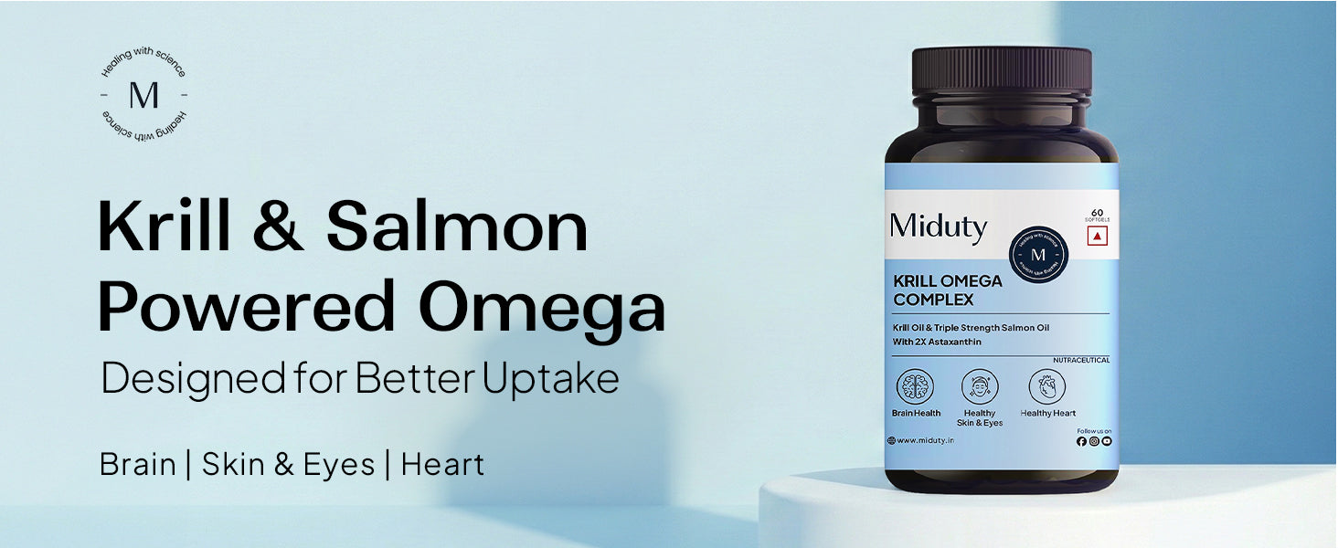 Miduty Krill Omega Complex is thoughtfully formulated to address this imbalance using a powerful combination of Antarctic krill oil, Triple-strength salmon fish oil, EPA, DHA, and Astaxanthin-chosen for their absorption, stability, and cellular benefits.