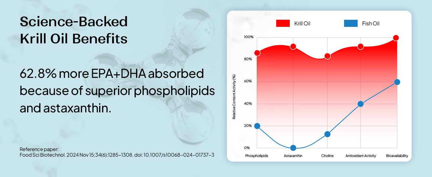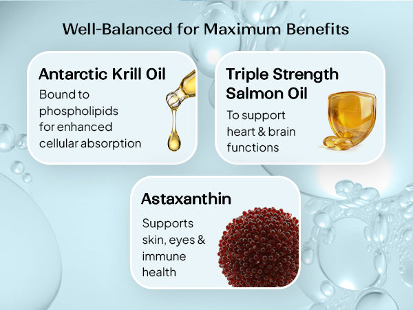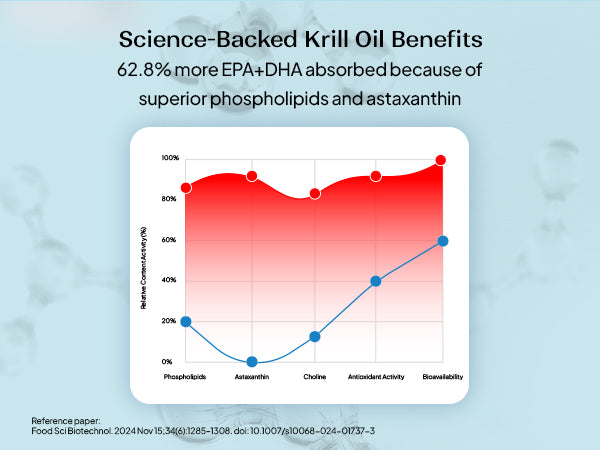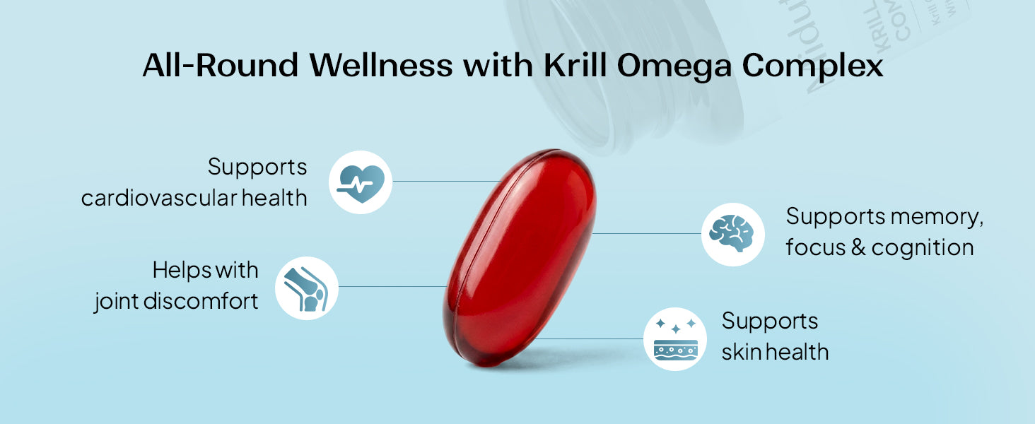 Krill omega complexes support cardiovascular health, brain function, joint comfort, and antioxidant balance.