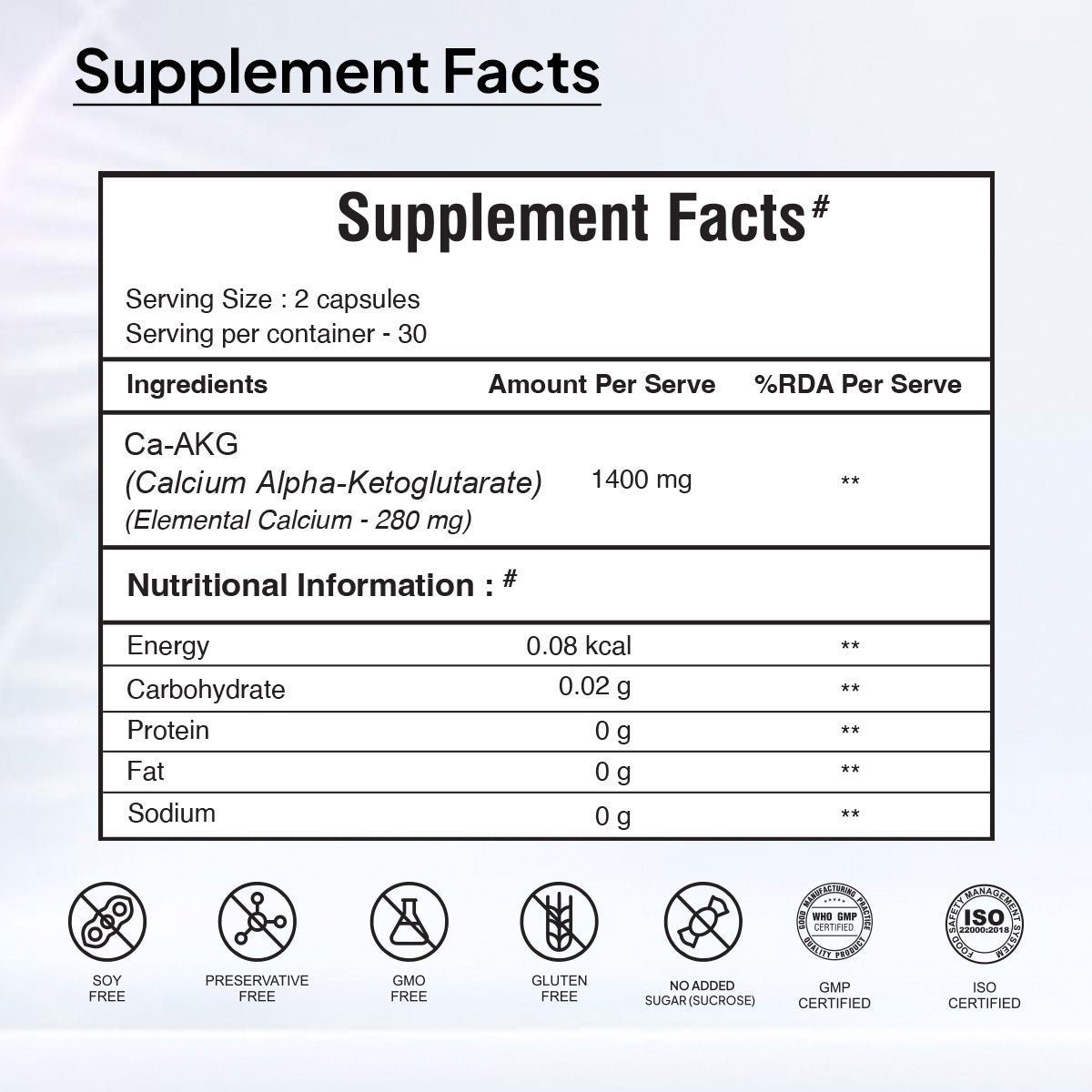 Calcium Alpha-Ketoglutarate (Ca-AKG) is a dietary supplement that contains calcium combined with Alpha-Ketoglutarate (AKG), a naturally occurring metabolic compound.