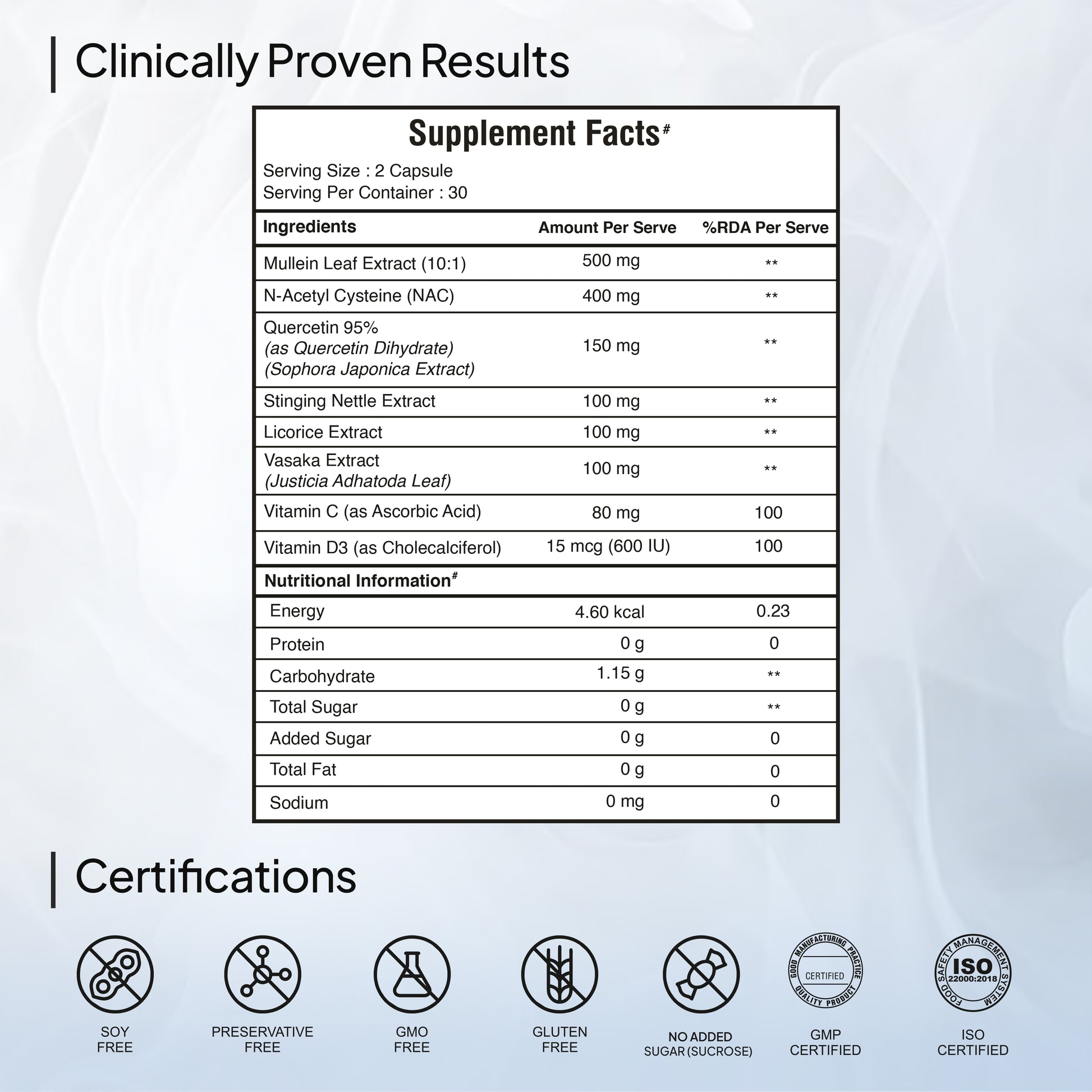 Practices like staying hydrated, using steam inhalation, and incorporating herbs such as Vasaka and Mullein Leaf Extract are described in wellness and traditional dietary sources. NAC and Quercetin are recognized ingredients in dietary supplements.