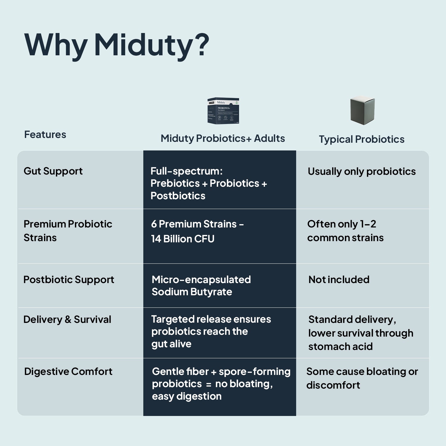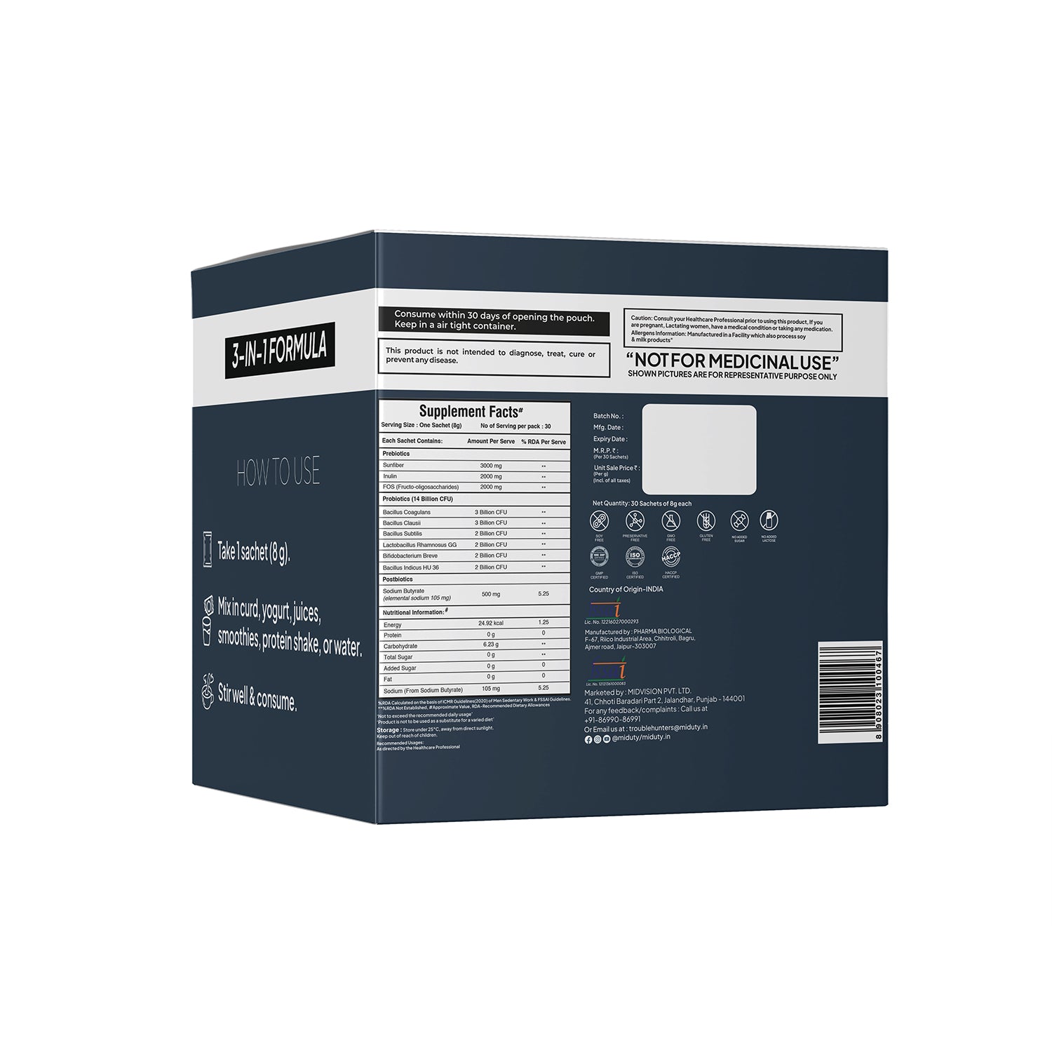 Miduty PROBIOTICS+ is India’s First Prebiotics + Probiotics + Postbiotics formula for adults, designed to provide complete, triple-action gut support. It combines Sunfiber®️, FOS, and Inulin to nourish good bacteria, 14 billion CFU of clinically studied probiotic strains to restore gut balance, and 500 mg Sodium Butyrate as a postbiotic to strengthen the gut lining and support better nutrient absorption.
